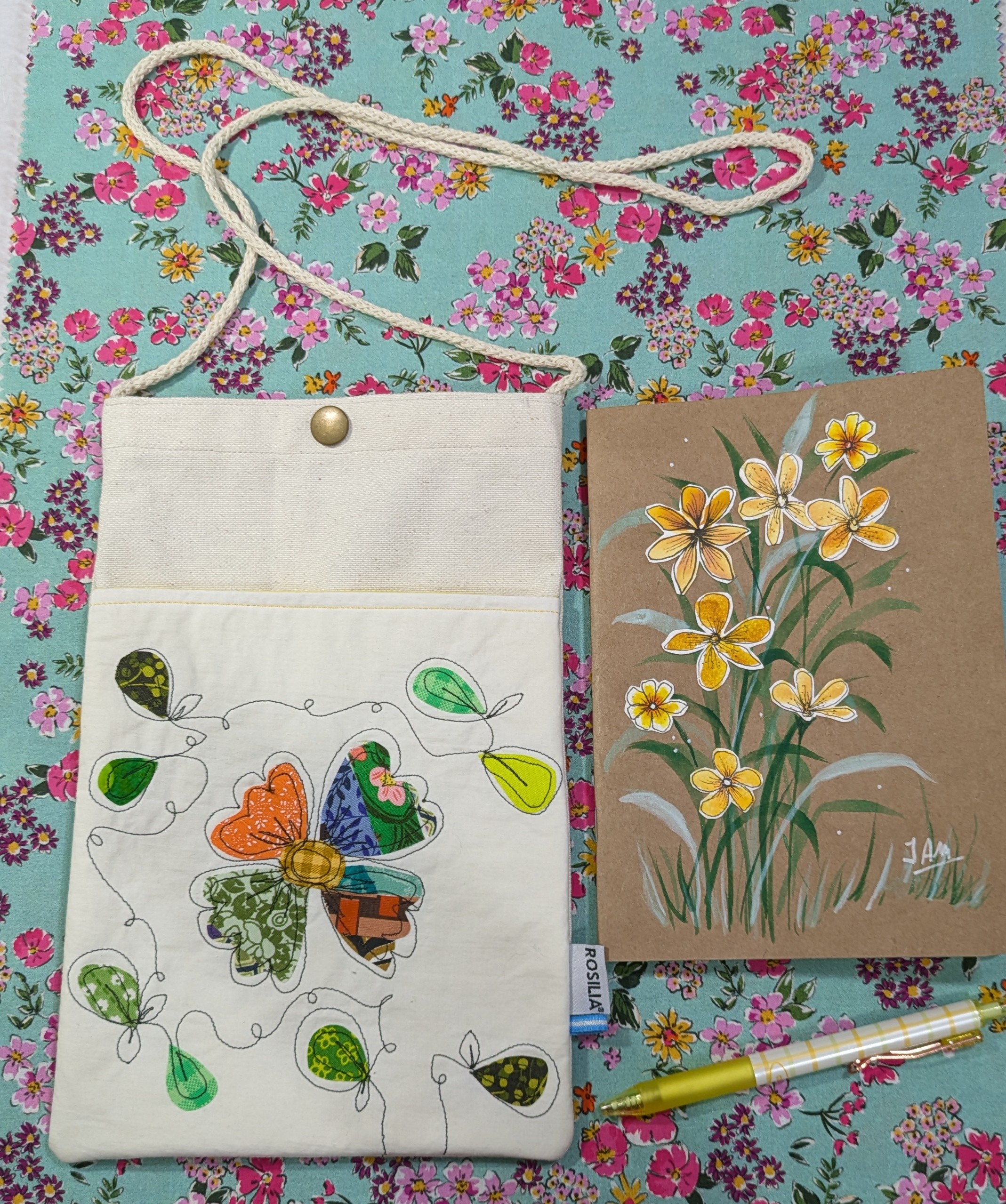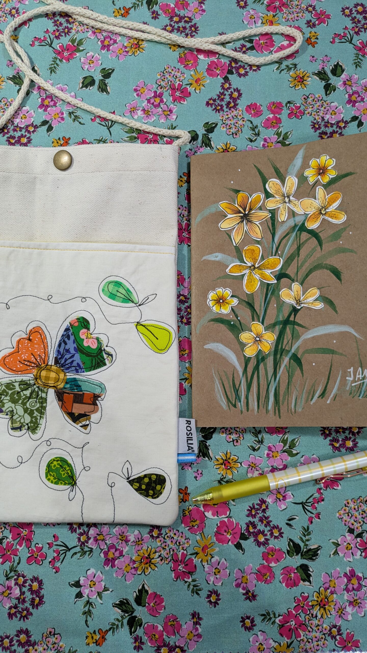 Mi mamá pinta y yo coso, juntas creamos un pequeño jardín con muchas flores! El kit primavera súper limitado trae: Libreta pintada a mano tamaño A5 Bolsito con broche y un bolsillo donde tiene el arte textil floral con tira de algodón Una birome divina para que vos puedas florecer tus ideas!